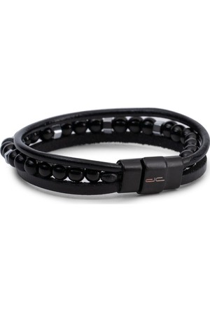 Gri Boncuk Detayli Siyah Erkek Celik Deri Bileklik Welch